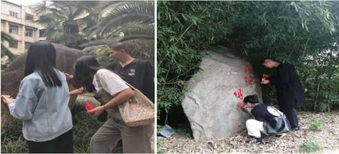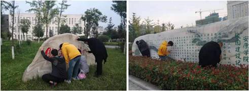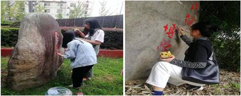 920--23日,365英国上市官方网站美术学专业员工开展了为期4天的美化校园实践教学活动。在公司宣传部、统战部的统一部署下,365英国上市官方网站副经理孙海洋带领美术学专业30余名同学制作方案、购置工具、颜料,采取刀挖去垢、清洗去尘、一遍打底、二遍分层、三遍施色等方式,分工合作,为6块大型校园文化墙和文化石进行增色添彩。