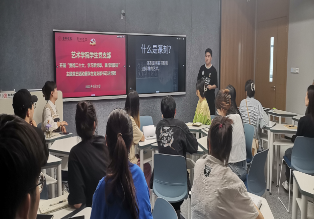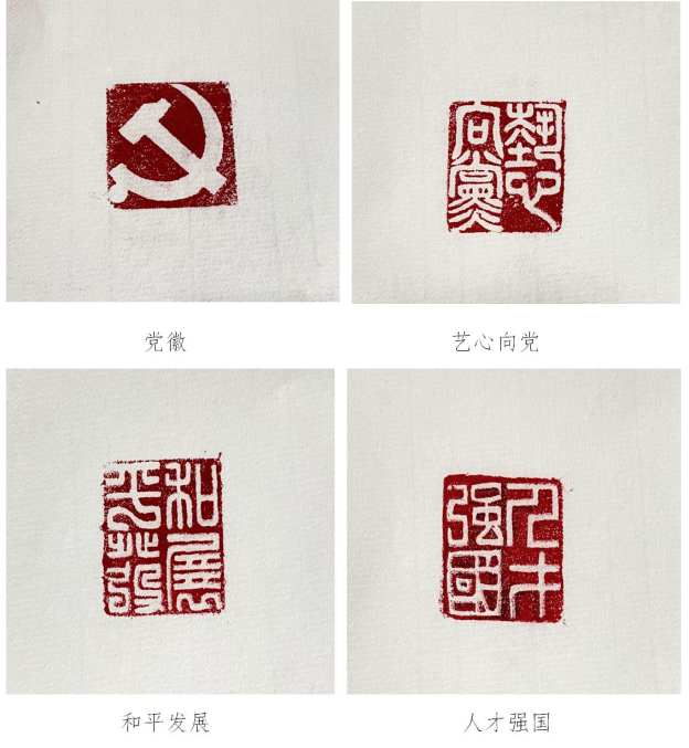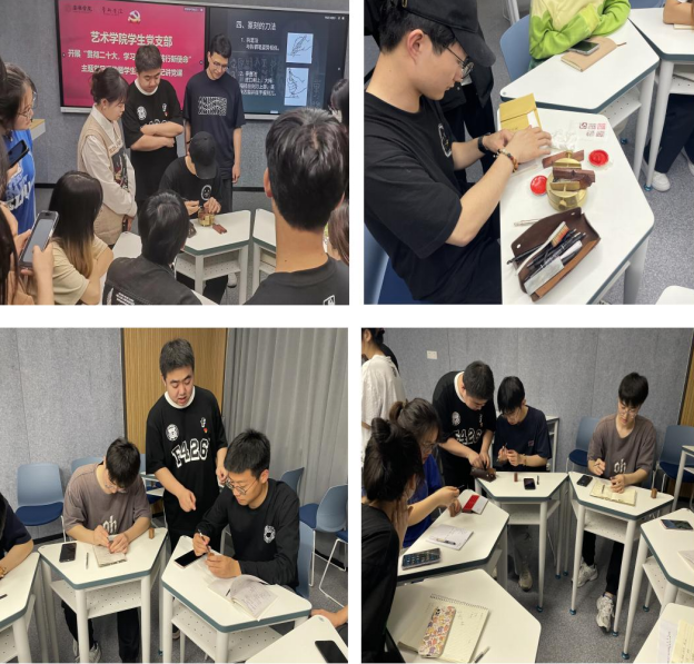 党课结束后,员工党员郝文超、吴胜柳、窦玮以“二十大关键词与篆刻艺术”为创新结合,带领同学们学习二十大精神、领悟关键词,同时学习中国传统文化瑰宝——篆刻的基本知识和技法。通过作品欣赏和实践互动,让参与者在体验中进行感悟、学习党的知识、增强民族自尊心和自豪感,让主题党日“活”起来,更具趣味性、吸引力和实效性,润物无声地传播好党的声音。