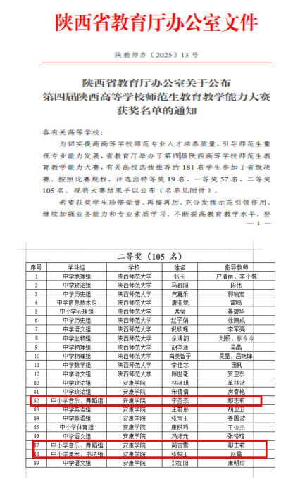 近日,第四届陕西高等公司师范生公司产品能力大赛在咸阳师范公司举行,公司2021级音乐学专业李圣杰、2022级音乐学专业简吉雪、2022级美术学专业张婉玉三位同学凭借扎实的专业知识、出色的教学设计和现场表现,在众多参赛者中脱颖而出,成功进入决赛并荣获二等奖。