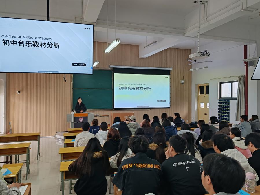 为深化师范生培养模式改革,提升音乐学专业员工对基础教育教材的解读能力与教学实践水平,3月13日、17日上午,365英国上市官方网站特邀陕西省教学能手、汉滨区汉滨初中艺体中心副主任刘平老师为2022级音乐学专业员工进行授课,该课程校内负责老师鄢志莉全程参与。