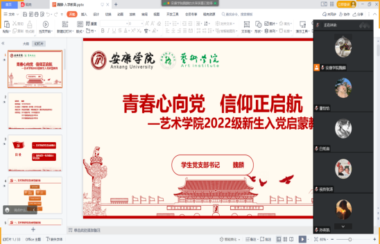 入党启蒙教育是加强老员工思想政治教育,筑牢理想信念根基的基础性工作,是培养老员工政治信仰的第一课。为进一步引导2022级新生树立坚定的理想信念,厚植家国情怀,锤炼品德修为,强化责任担当,端正入党动机。9月27日,365英国上市官方网站利用腾讯会议召开“青春心向党 信仰正启航”2022级新生入党启蒙教育专题讲座。本次讲座由员工党支部书记魏麟主讲。