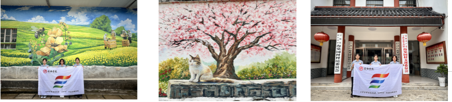 经过实地调研,队员们结合宁陕县的自然风光、海棠园村的产业特色和红色文化底蕴,确定了多个墙绘主题方向。在调研过程中,队员们重点关注了村里已有的墙绘作品。以养蜂产业为主题的墙绘,生动展现了养蜂人劳作的场景,还有可爱的卡通蜜蜂形象,很好地宣传了村里的特色产业;描绘自然景观的墙绘,樱花树下猫咪静卧的画面温馨动人,青山绿水间的乡村民居错落有致,尽显乡村的宁静与美好。这些墙绘作品不仅美化了乡村环境,也传递出乡村的文化内涵。此外,红色党建主题的墙绘也在规划之中,将进一步弘扬村里的红色文化精神。