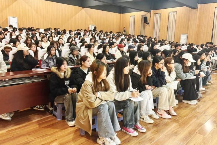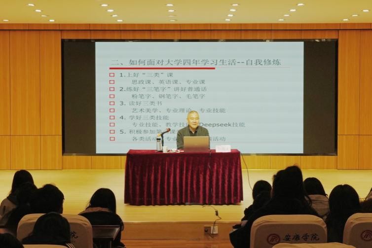 讲座伊始,孙海洋对公司各专业进行了详细阐释,明确强调了以立德树人作为根本任务,致力于培养德智体美劳全面发展的人才培养要求。同时剖析了艺术生大学四年的学习规律,并从上好“三类”课,练好“三笔”字,学好“三类技能”等方面对如何度过大学四年的学习生活给出建议。通过一系列丰富生动的事例,引导同学们拓展专业视野,坚定理想信念,守好意识形态底线。