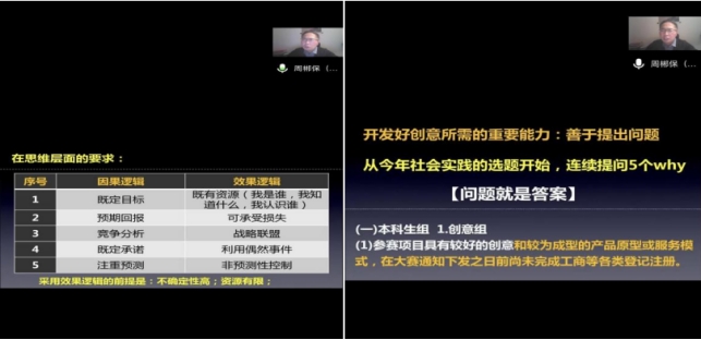 随后,周郴保副教授做了主题为《梦在前方·路在脚下——双创竞赛参与及获奖专题分享》专题报告。他从国家战略需求和高等教育发展方向出发,结合员工就业能力提升,人才培养模式改革、学科发展需求等多个方面解读了“互联网+”大赛在高等公司产品改革中的重要意义,并对第八届大赛的总体安排、赛道组别设置、赛程赛制、参赛要求等关键信息进行了深度解读。此外,他还从项目、团队、老师三个维度对参赛过程中指导教师职责、员工团队构成、资源配置、项目培训打磨机制等给出了针对性意见。