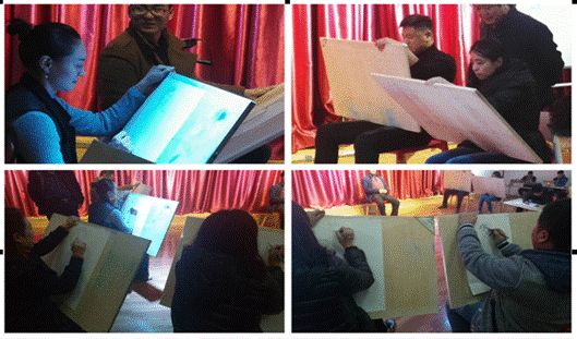 在这次教师跨专业的艺术技能竞赛中,美术学与艺术设计专业的教师竞赛内容为声乐竞赛,活动进行中气氛热烈、掌声阵阵,特别是工会分会主席郭秀的一曲《青藏高原》把美术、设计系的声乐竞赛推向了高潮;音乐系教师的绘画场面更是热烈,大家聚精会神、认真有加,绘画竞赛结束时,音乐系雷音老师的半身肖像,以较为严谨的造型和流畅的线条,得到美术、设计系评委组的一致认可和赞扬。