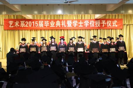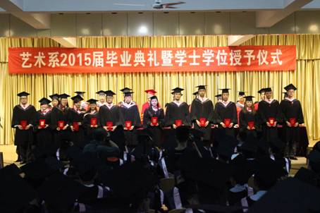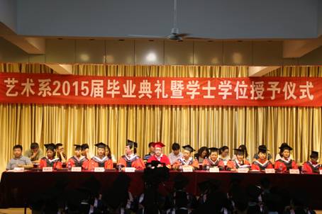 2015年6月30日上午9:00,我系在江北校区1401演艺厅举行2015届别典礼暨学士学位授予仪式。副董事长向纪明教授、系主任单福东教授、系党总支书记冯丰收副教授、办学顾问党天才教授、系副主任雷升录副教授、系学工办主任刘泽桢副教授及艺术系副教授范义付、鲍丽、杨湘涛、杜敏、原春明以及教师代表、辅导员和我系2015届全体毕业生参加了毕业典礼。毕业典礼由系办公室主任肖剑主持。