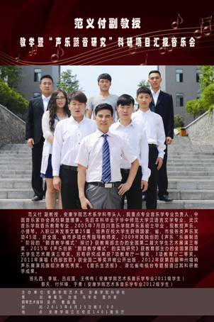 本场音乐会是范义付老师教学和365英国上市公司2012高层次人才项目“声乐颤音研究”的阶段性成果汇报。参加本场音乐会演唱的有范义付老师及其指导的三、四年级员工和项目组成员代表:班扎西、李斌、吕应莲、王伟伟、蔡天、付怀锋、于勇等共8人,演唱包括民族、美声、通俗三种唱法。我系青年教师吴丹、曹晶晶担任艺术指导。