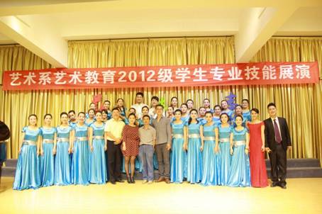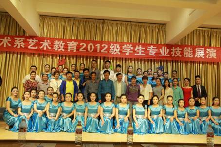 2015年5月17日晚20:00,艺术教育2012级员工“艺青春”专业技能展演在江北校区1401演艺厅拉开帷幕。本次展演以追忆青春、回首大学三年的时光作为初衷,由刘泽桢、田川老师作为总策划人,班团干部精心组织同学们积极参与,全班35名同学凝神聚力成功举办了这次展演活动。应邀观看展演活动的有系党总支书记冯丰收、系副主任雷升录、系办公室主任肖剑、艺术教育专业课老师等二百余名师生;同时还特邀了安康市儿童福利院领导、老师光临晚会现场。