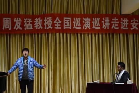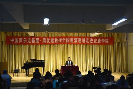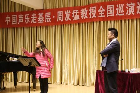 周发猛教授首先向在座的师生们展示了他“中国声乐走基层”在全国各地巡演的现场视频,随后的报告中周发猛教授用通俗的语言和风趣的教学方法与师生代表互动交流,从发声技巧、高音突破、肢体表演以及如何在演唱中对情感的运用等方面,作了详细的学术演讲。同时对艺术系部分师生现场演唱进行了指导、点评,他强调了情感的运用及舞台的表现在声乐演唱中的重要性,并以自身丰富的演出经验为例,为大家讲解如何投入感情的去演绎一首作品。周发猛教授的“哭腔”、“打哈欠”、“叹气”等特殊的歌唱技巧,让原先歌唱中存在的高音细节更加完美。周教授极具亲和力和感染力的讲解及精湛的示范演唱多次赢得了在座师生的热烈掌声。