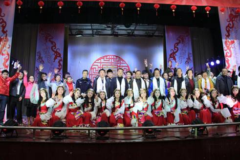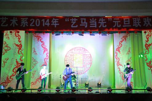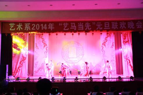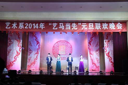 开场时活力四射的爵士舞霎那间点燃全场观众的热情,“蓓蕾”瞬间绽放,艺术风采从此展现!UN乐队充满激情演唱的《我们的新时代》,引起了全场“90后”老员工的共鸣,大家不禁跟着乐队挥手唱起来。陕西电视台“都市碎戏”栏目组特邀剧社——艺术系蜗牛话剧社表演的《大宝天天见》,以幽默诙谐的语言,憨态可掬的肢体表达,使得全场观众忍俊不禁,掌声连连。正值迎马年之际,我系外聘教师翟新华老师带领员工为大家演奏了二胡曲《赛马》,激扬的乐声、奋起的马蹄声,现场观众仿佛驰骋于广阔的草原之中,在新的一年我们要“一马当先”。晚上九点五十分,艺术系2014年“艺马当先”元旦晚会在音乐学专业藏族员工班扎西演唱的《高原红》中圆满结束,藏舞的舞者为嘉宾献上了圣洁的哈达,表达了我们的新年祝福!