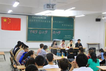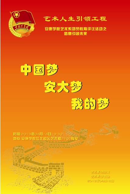 2013年4月14日晚7:30分,艺术系团员教育评议系列活动之“中国梦·安大梦·我的梦”座谈会在江北校区2102教室隆重召开。艺术系党总支书记冯丰收、学工办主任刘泽桢、员工党支部书记王毅、团总支书记黄娟以及各班团支部成员、班长约一百余人参加了座谈会。会议由黄娟老师主持。