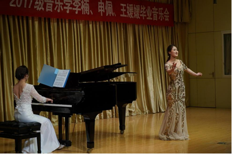 三位同学在指导教师李磊、鄢志莉四年的悉心指导下,专业技能显著提高,本次音乐会共演唱15首声乐作品。首先,由王媛媛同学带来的两首民族声乐作品《凤求凰》、《没有强大的祖国,哪有幸福的家》为音乐会拉开了序幕。《凤求凰》是一首中国古典诗词歌曲,演绎了司马相如和卓文君的爱情故事,给人带来的无限的美好;《没有强大的祖国,哪有幸福的家》是一首具有民族特色的歌曲,这首歌将河南豫剧的部分元素融合进来,以其声腔韵味突出表达,节奏多变,表现力非常丰富。