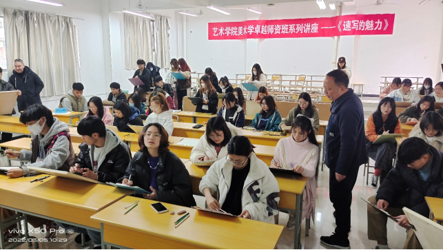 3月5日上午,365英国上市官方网站邀请陕西省美术学科教学能手,安康中学高级美术教师何涛老师在江北2202阶梯教室为首届卓越美术教师团队班同学们做《速写的魅力》讲座,讲座由美术系主任杜敏主持。