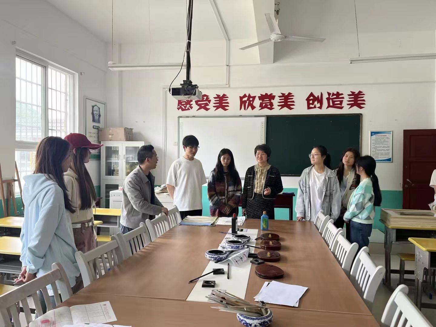 活动伊始,美术系主任杜敏,教师毛德龙带领员工前往岚皋县花里初级中学,参观校园,了解花里中公司情及美育课程建设情况。师生走进美术教室,观摩教学过程,与花里初级中学师生们进行了互动交流。通过近距离接触,员工们感受到了基础教育对中员工成长的重要性,同时也对美育教育的责任感有了更为深刻的认识,激发了他们对服务基础教育工作的热爱与责任感,促进了同学们投身基础教育教育情怀的培养。