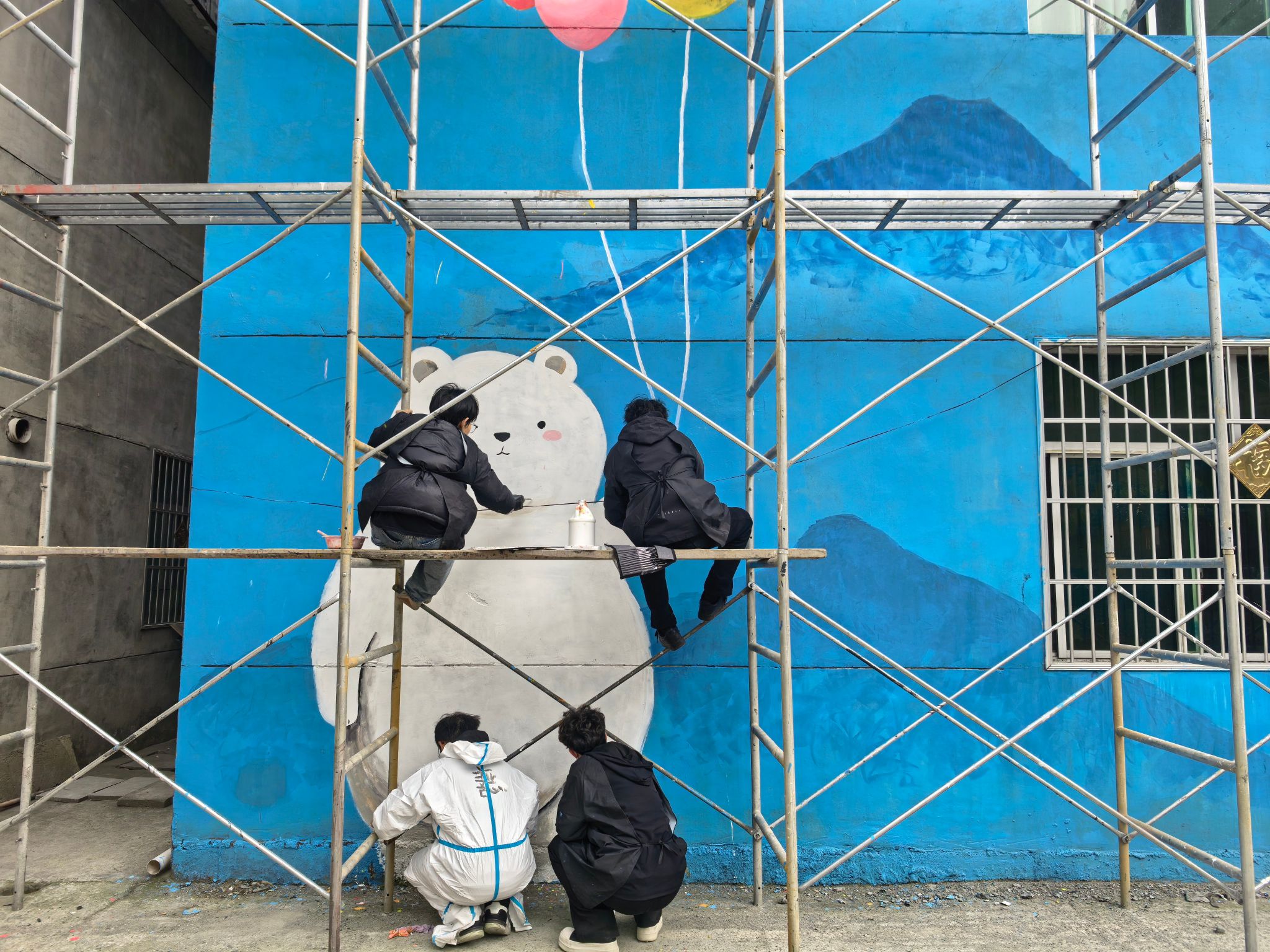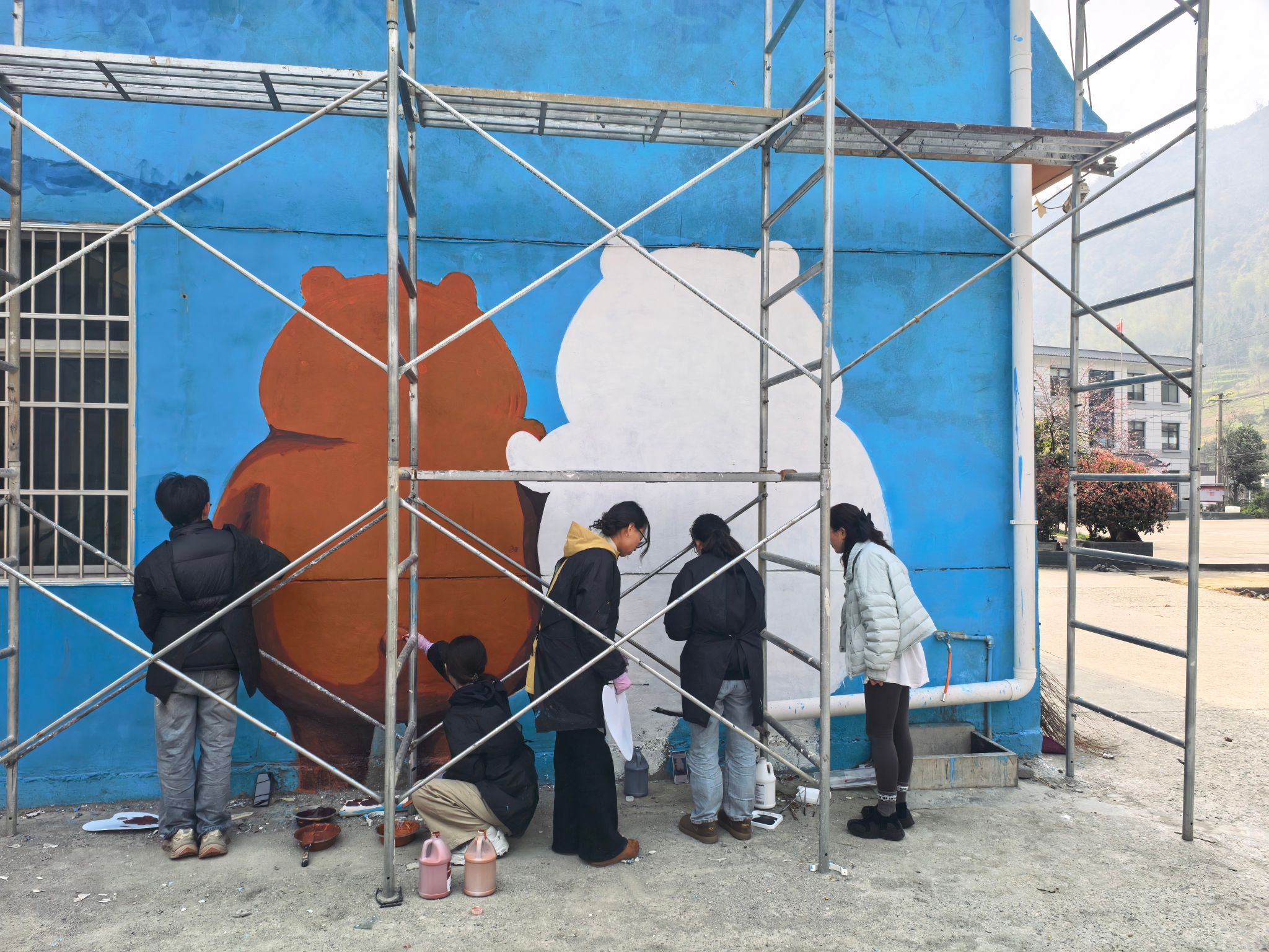 绘制现场,志愿者们分工明确、配合默契,打底勾线、调色上色有条不紊。大家顶着户外作业的辛苦,认真细致、精益求精,将一幅幅生动鲜活的图景呈现在墙体之上。原本普通的老旧墙面焕然一新,色彩鲜艳、富有创意的构图与周边民居、自然环境相映成趣,成为长春村一道亮眼的文化风景线,赢得了当地村民与过往行人的一致好评。
