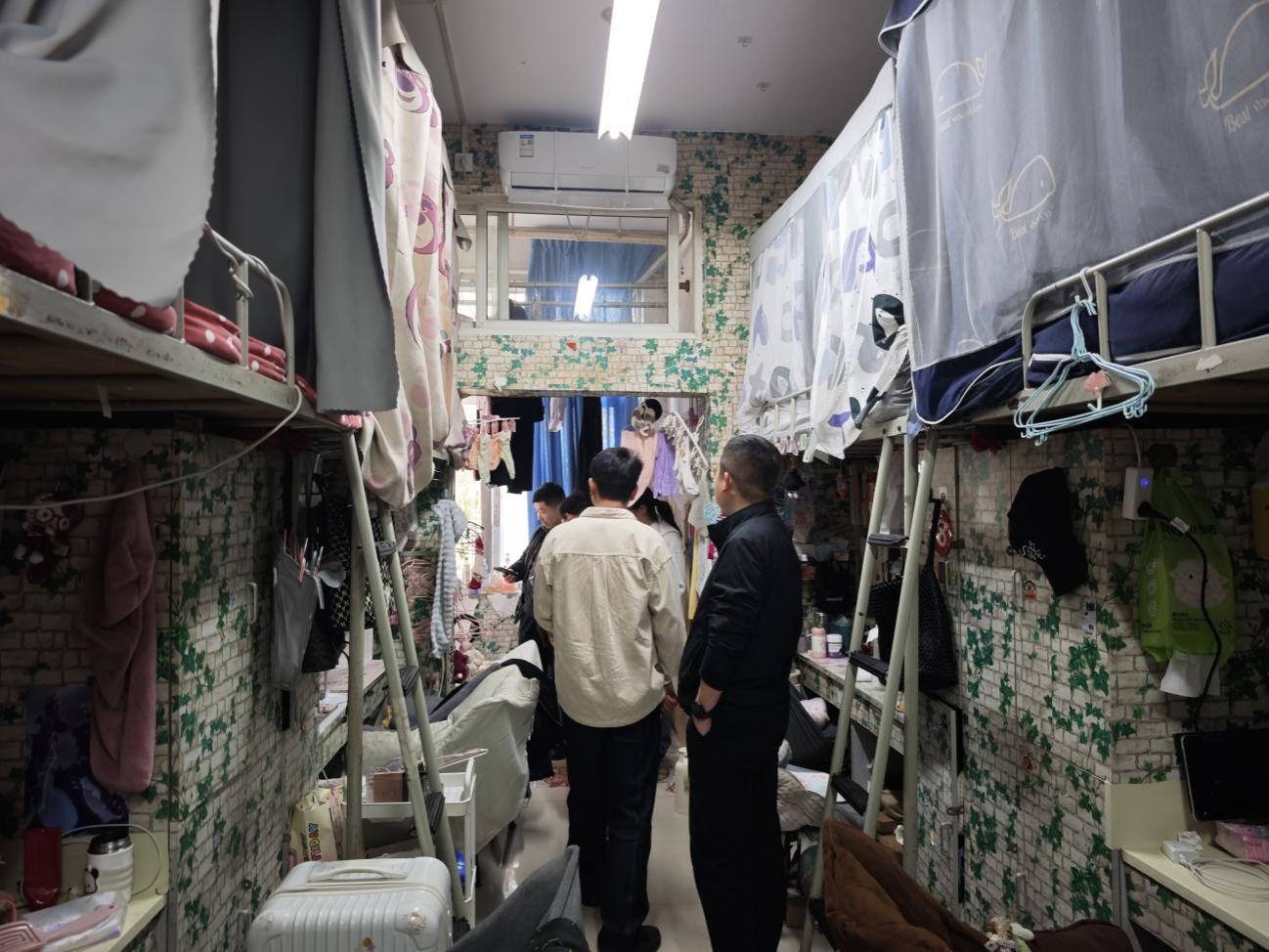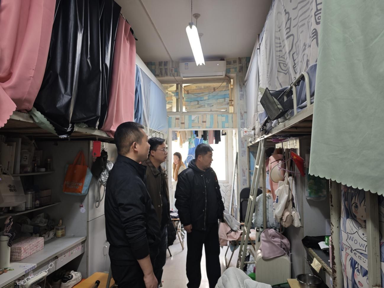 主题班会结束后,公司党总支书记张慧带队,党总支副书记肖剑、全体辅导员及员工干部组成检查组,深入全院员工宿舍开展“全覆盖、无死角、重实效”的安全隐患大排查。检查过程中,老师们逐间走访,重点排查违规电器、私拉乱接电线、易燃杂物堆积、门窗损坏、消防设施等安全隐患。