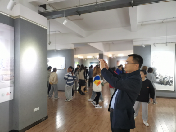 活动伊始,李秀春老师介绍了本次艺术文化月活动情况及本次展览的主题随后,毛德龙老师就中国近现代中国美术史的发展,以及美育时代背景下如何提升自身的审美水平进行了讲解与引导,和同学们一起从前沿开始,了解了历届师师姐的创作思想情感和艺术追求。对不同画种的创作,从构图、色彩、技法的变化与思想情感的联系,着重于画面整体布局及情感元素,给同学们进行了解说。他表示:美是纯洁道德、丰富精神的重要源泉,要求同学们要热爱生活,用眼去发现美、欣赏美,用心去感受美、认知美。
