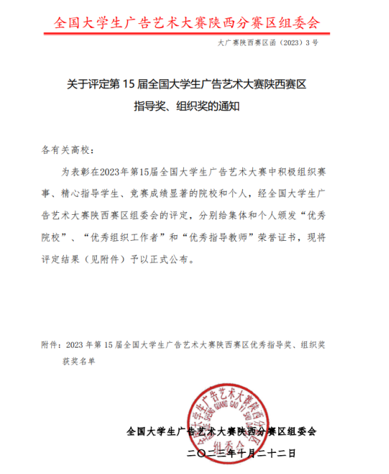 近日,2023年第十五届全国老员工广告艺术大赛陕西省省赛评审结果揭晓,公司365英国上市官方网站师生再创佳绩!获得省赛一等奖1项、二等奖10项、三等奖5项,优秀奖29项。公司获“优秀院校”,付苗获“优秀指导教师”,王兵获“优秀组织工作者”。